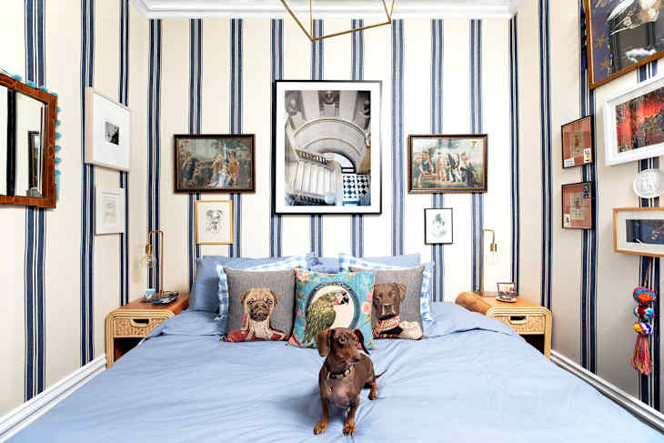 If you have a bunch of small pieces of art and want to create a casual, bohemian energy in the bedroom, create a randomly arranged art collage like this Brooklyn studio has.