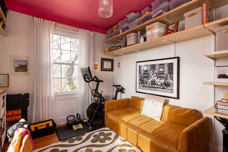 Storage — whether it’s open shelving or baskets — doesn’t always have to be out in the open. It should come with some choice. Imani’s home office is exceptionally organized, largely thanks to The Container Store’s Elfa shelving system. The room is her place to get creative, work on home projects, and film content, so tools and tripods need to be easily accessible at all times.