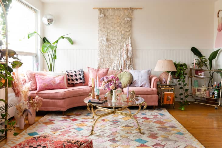 If you’re trying to figure out how to add more color to your home, you don’t always have to pull out your paintbrush. While murals and painted arches will definitely do the trick, you might not have the time to pull these projects off properly. Don’t feel bad though! There are all sorts of creative ways to make your home more colorful and exciting. Take renter Luna Lindsay‘s 1,200-square-foot apartment in Toronto, for example, which she shares with her partner, Bruce Forrest, and her dachshund, Elmer. Originally, her apartment had gray walls and black trim, but she found a way to lighten and brighten it up with an artful mix of pastels and fresh decorating ideas. “When moving in, my now pastel palace was the complete opposite of what she’s blossomed into,” says Lindsay, a full-time content creator on Instagram and TikTok who just launched a candle business called Moonwix. “I love looking at life through color, so I knew I wanted that to be reflected where we live.”