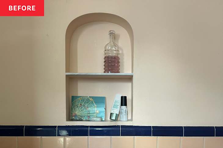 Let me rewind a bit to give you a sense of that space. My house is in the suburbs of Cleveland and still has an original 1938 bathroom. It’s one of the reasons we purchased the home — I was obsessed with the navy blue sink and tile trim that outlined the 4-by-4 vintage peach tiles. Next to said sink is a little arched niche, which was cute but unimpressive, as it was just painted a light pink to match the surrounding walls. I used it as a drop zone for bobby pins, hair ties, and face creams. Last year, I did add a faux marble peel-and-stick countertop contact paper on the shelves to spruce it up, but this detail did nothing to make me want to keep it organized.
