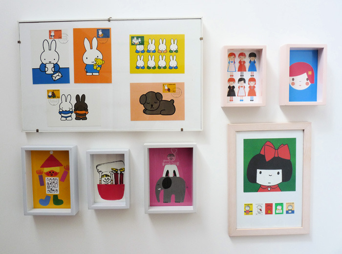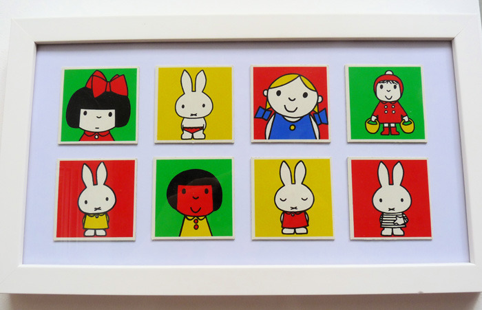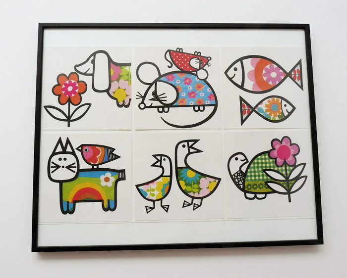 I added the spotty paper to the mini white shelves in her cosy corner. (where she keeps her tea set etc..) I framed various post cards and vintage memory game cards for her wall.