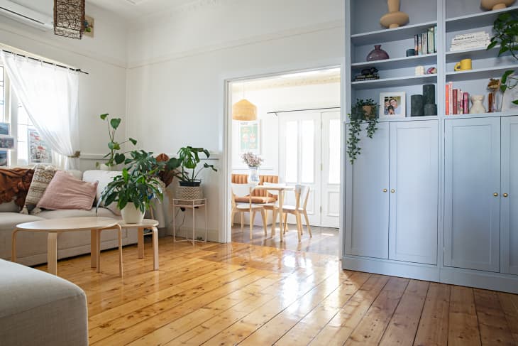 She created three arch-shaped shelves with HAVSTA bases, plywood for the arches, trim that follows the curve around the arches, and a peachy pink paint. Rachel says on Instagram that plywood is your built-in bookcase BFF because it can help you space your shelves out according to the width of the room and add other details like trim or sconces in between, if you want.