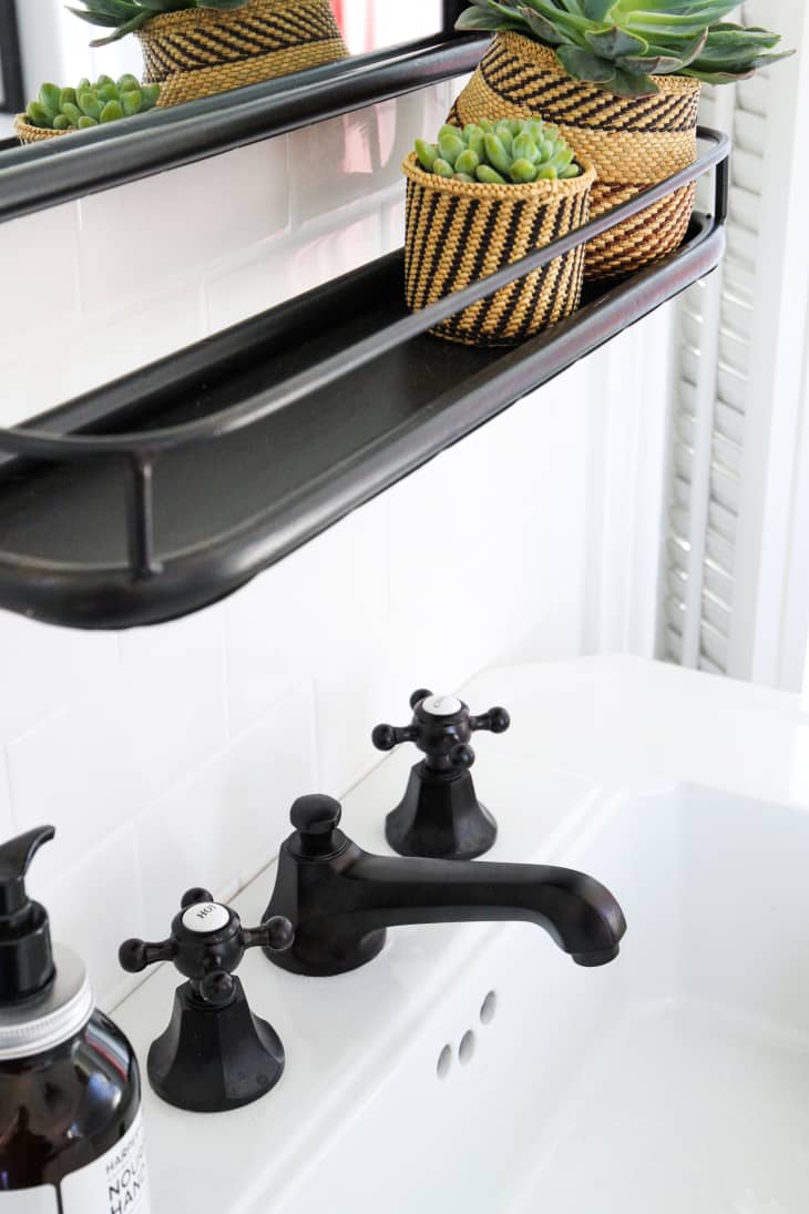 Above, Ashley chose a white pedestal sink from Kohler. The model she picked (from their Kathryn series), has three 8″ widespread holes, which is common in these types of sinks. After a couple of purchases and subsequent returns, she finally settled on this faucet from Kingston Brass.