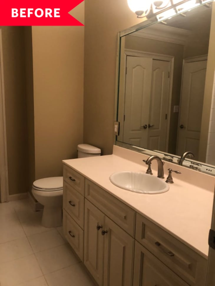 If you’ve ever seen Papier’s work on Instagram, this kind of quirky, daring redo isn’t exactly out of character. “I’ve never been shy about color, and our home has a lot of bold choices,” she says. That’s probably why the existing bathroom, which was fifty shades of beige—and not in a good way, had to go. She and her husband, Alan, had just enough money left over from their kitchen renovation, which they tackled first, to also scratch this project off their list.