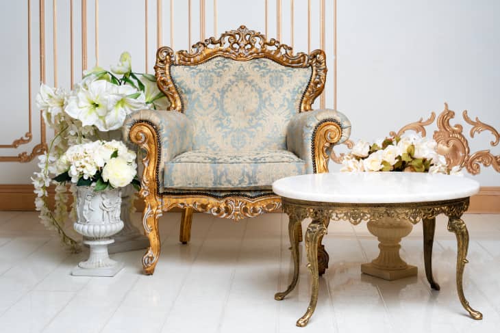 On colors, Gill added that you should choose “deep rich tones such as purples, blues, and reds” or “muted pastel tones such as pinks, whites and light blues and greens” paired with a metallic to add some luxe into the look. Gill explained that the Palace of Versailles is the perfect example of the style.