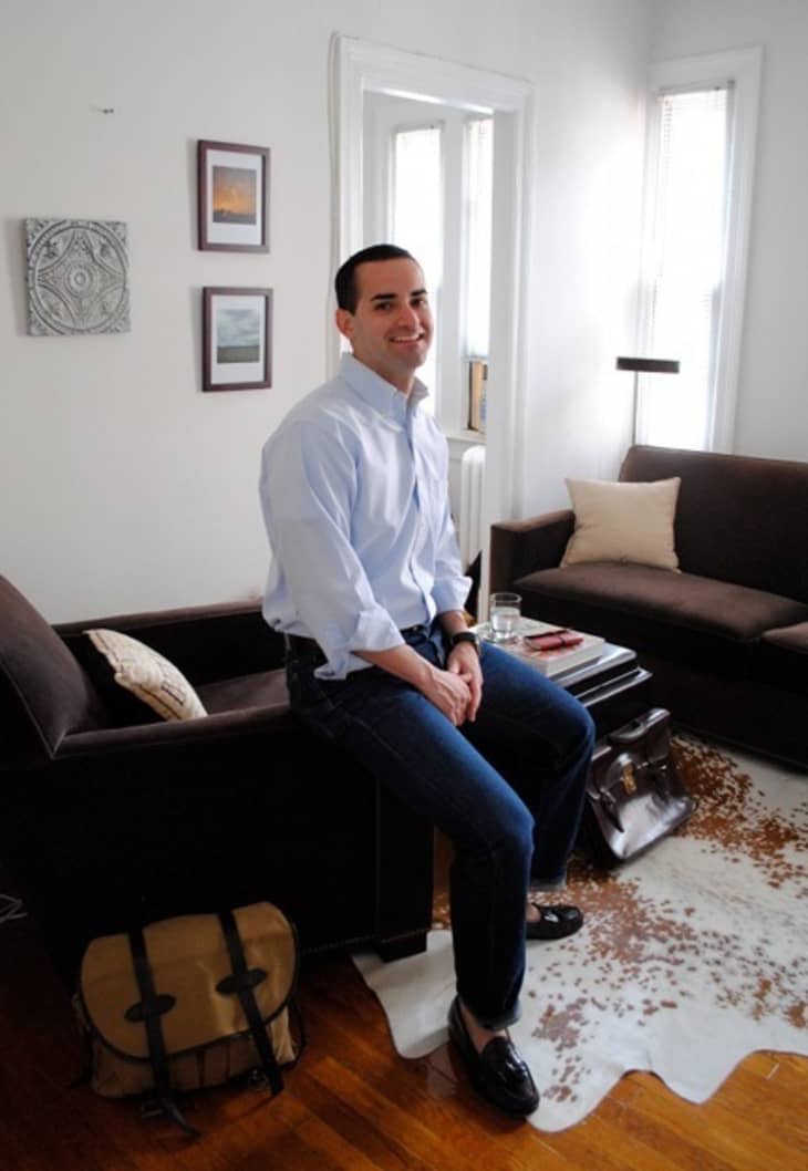 Overall, he has created a layout that flows naturally, maximizes the functionality of each corner, and even leaves room for purely decorative touches. The placement of the couch and chair clearly designates a space for socializing — which is important to Ryan, considering he hosts up to fifteen people in his apartment for dinner parties. When the weather is better, they move out to his apartment building’s lush courtyard to grill. Freeing up the extra space at the end of his kitchen, he has brought in a desk and fashioned a small office area.