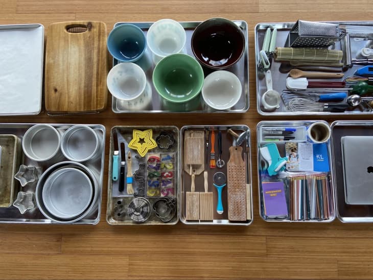 Here’s what my sheet pan rack looks like right now: I have wooden cutting boards on top of wire cooling racks (so they can fully dry and air out) on the bottom tray. Then, I have cake pans on a full sheet tray above that. Next up, I have a taller “shelf” for mixing bowls. (Just don’t put a sheet pan on every slide and you can have taller shelves!) Then comes a full tray of my favorite, most-used utensils, like my Thermapen and measuring cups. Above that, I have two half-sheet trays dedicated to the projects I do most often: One tray for pasta-making tools, and another for cakes and cookies. Then, dedicated parchment paper storage. I keep the top slot for my “office” — my laptop gets its very own pristine, clean tray, and the half-sheet behind it holds my label maker (can’t go a day without it!), notebooks, pens and Sharpies, and other business materials.