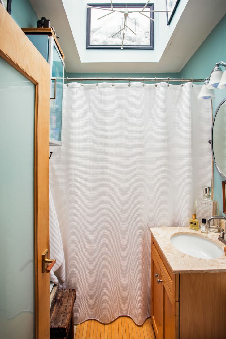 Small bathroom with skylight, white shower curtain, wooden vanity, and light blue walls.