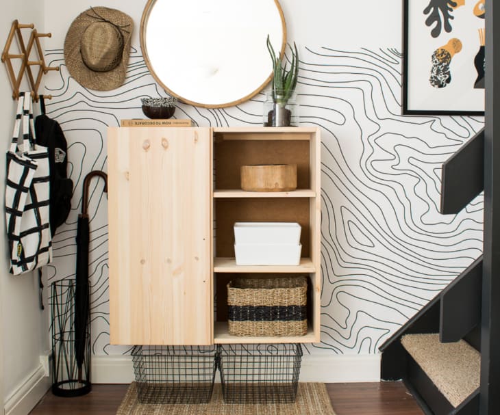 I mean, this is a tiny entryway. Like Robinson, Julie Christiani of Ikea Hackers uses an IKEA shoe cabinet in her entryway—but in a smaller form to accommodate the smaller wall space. She glued hooks to the inside and hangs her keys, and uses the inner compartment to sort her mail, too. The small ledge on top allows her to keep a bowl for loose change, and the addition of the mirror and plant takes this from a basic IKEA shoe cabinet to real entryway.