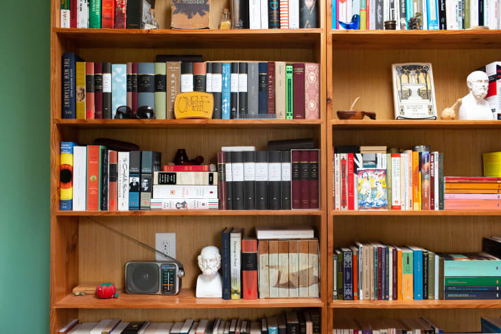 When you’re faced with few walls—or in some cases, no walls—to place big pieces of furniture against, double up, putting your bed in front of a bookshelf. You get a big statement headboard visual, plus extra storage.