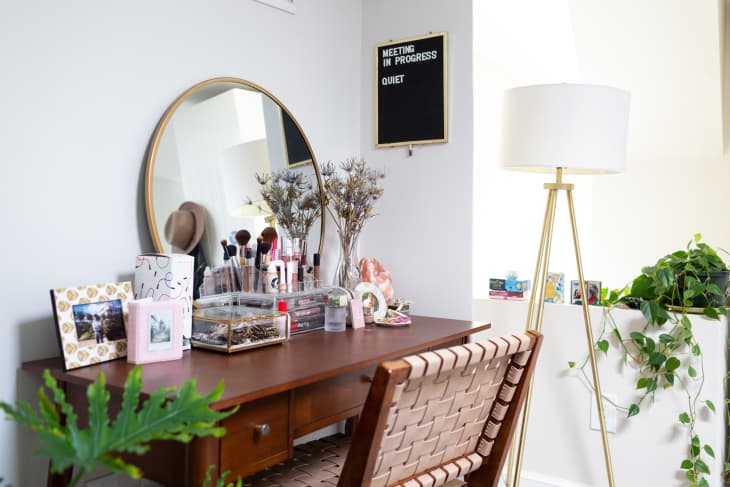 No judgment toward anyone who keeps their makeup in a bag, but there’s something so grown-up about having a dedicated vanity or a specific spot for beauty products. Unfortunately, my apartment bathroom is way too small for that, and my bedroom barely has enough space for my work desk, let alone a vanity. Still, I realized my work-from-home setup could double as a beauty storage area … with the right solution.