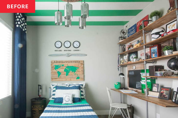 The project started after Aiden swapped bedrooms with his teenage brother. The room before was designed with an older kid in mind, and had a kelly green striped ceiling as well as industrial elements like a locker bed, a wood and pipe desk and shelves, and a light fixture made out of a wooden spool.