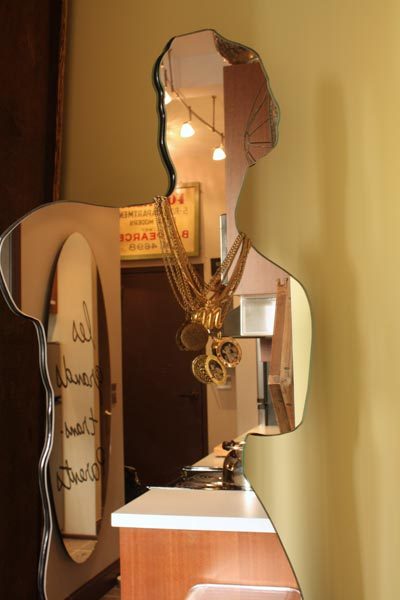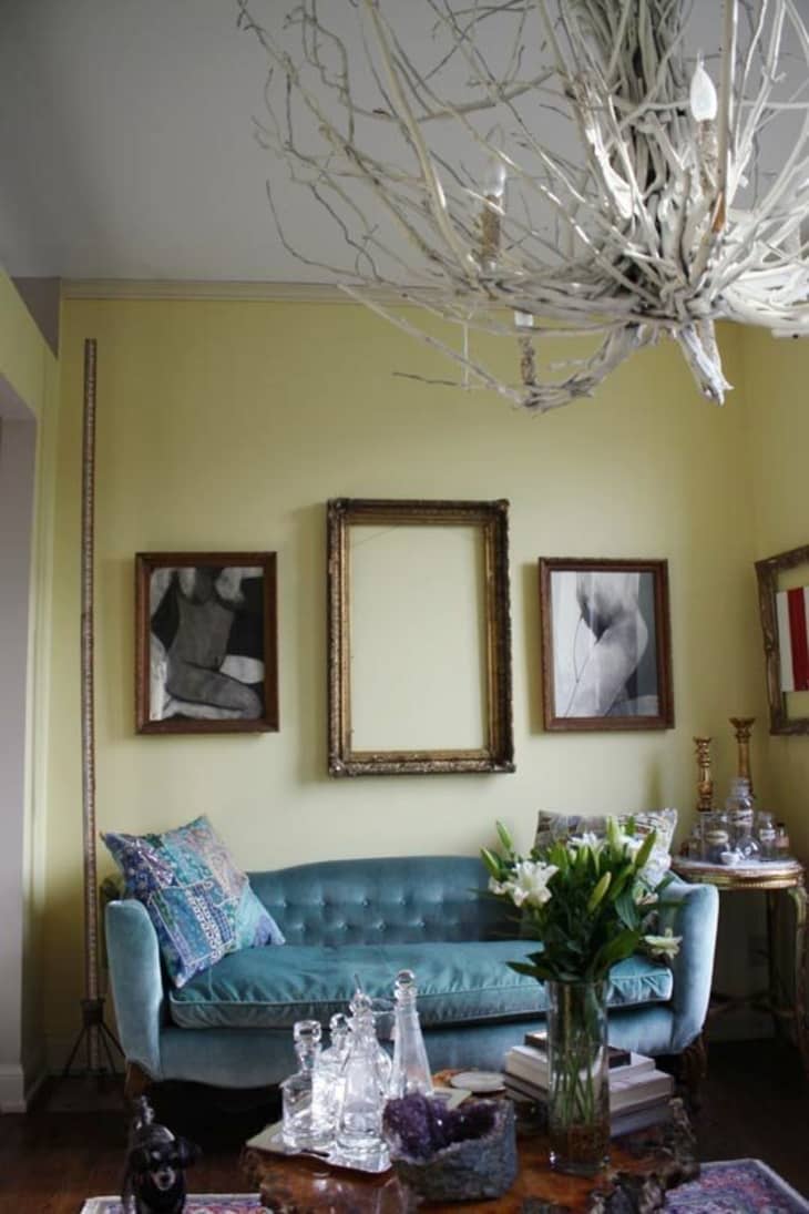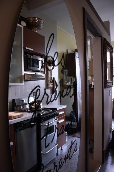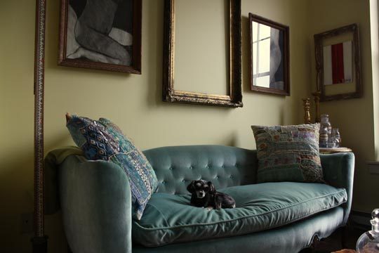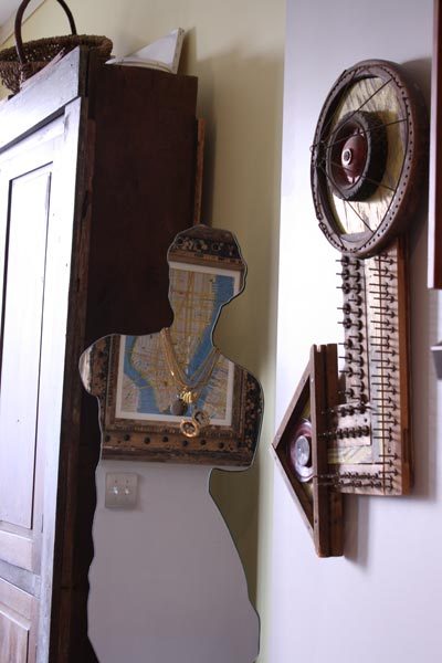 Suzi is co-owner of Collier West, a Short North store that specializes in one of a kind, vintage and artisan-crafted home decor, lighting, textiles and jewelry. The shop, which Suzi describes as a “lifestyle store,” has the spirit of a Parisian flea market; that sensibility is extended to her home, which is awash with warm, romantic touches. Gilded frames, some filled with art, others not, abound; a life-sized mirror in the shape of Venus de Milo–a souvenir of Suzi’s days at Express, where she worked for 10.5 years–is draped with jewelry of her own design (her Pont Neuf jewelry line is sold at Collier West); and an elegant couch upholstered in a faded aqua velvet (on “permaloan” from a friend) rests next to an antique yardstick that reaches nearly to the top of her 11-foot-tall living room ceiling.