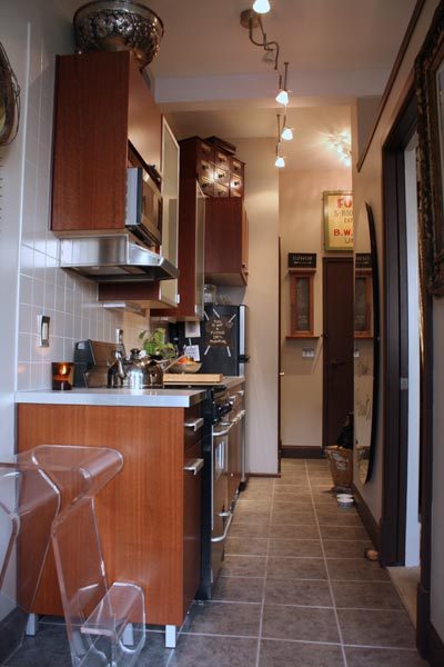 Suzi also made strategic decisions in the design of her space, such as forgoing a television and swapping out a space-hogging (and nonoperative) fireplace in favor of the cupboard. Suzi further provided her condo with a sense of space by using transparent acrylic stools, which seem to vanish in the room. And then there’s pint-sized Tchotchke, a schnauzer and poodle mix who weighs less than 10 pounds, making him the perfect size for the diminutive space.