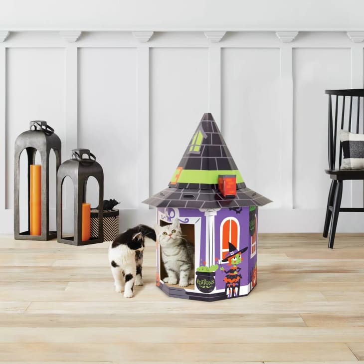 The cardboard scratchers are lightweight, easy to assemble, and you can create your very own kitty Halloween village by purchasing a few at the same time.