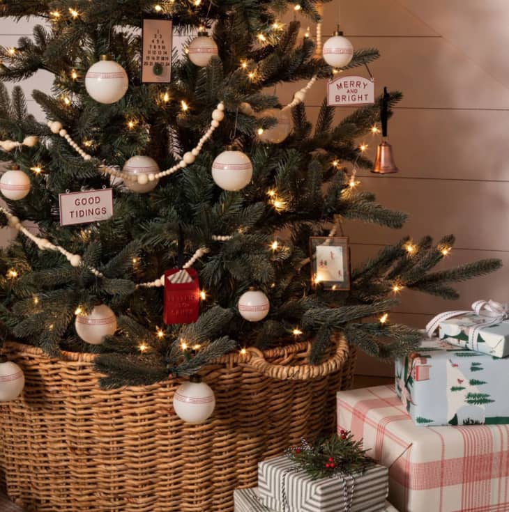 Compliment classic round ornaments with a miniature “merry and bright” ornamental plaque on those trees.