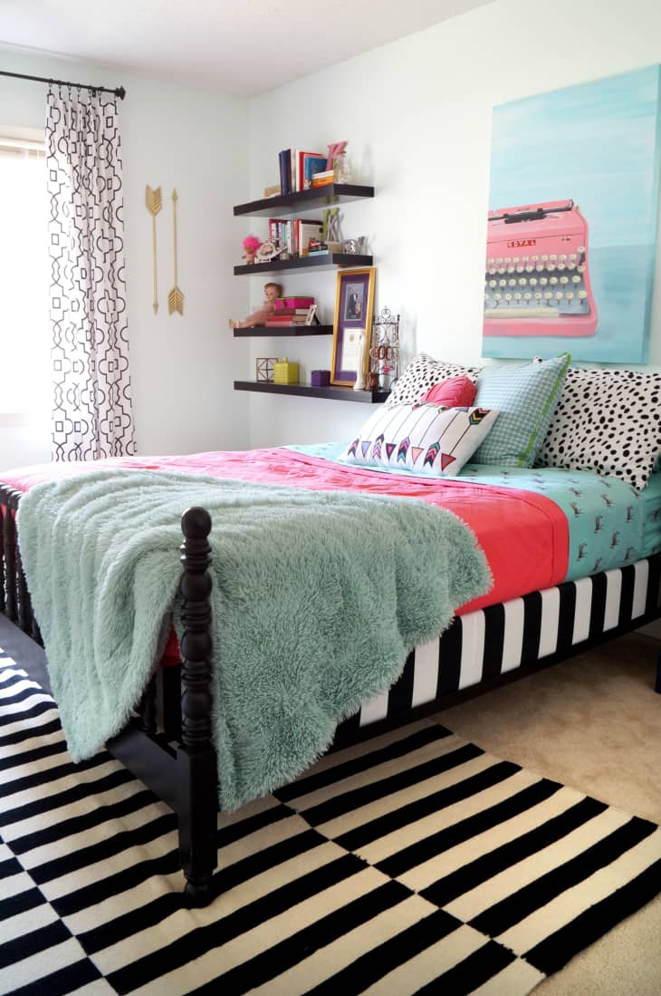 You won’t believe the drastic makeover blogger Tarina Lyell completed for her clients’ teenage daughter, Ella. Adding a stylish jute rug helps to camouflage ordinary wall-to-wall carpeting, and a Moroccan pouf can serve as extra seating or a comfy footrest. If you don’t have enough room for dedicated nightstands, pushing the bed into a corner and opting to place a desk on one side of the side of the bed is a great space saving solution. Same goes for the sweet Edison bulb light that’s swagged on a set of hooks on the opposite side of the bed.