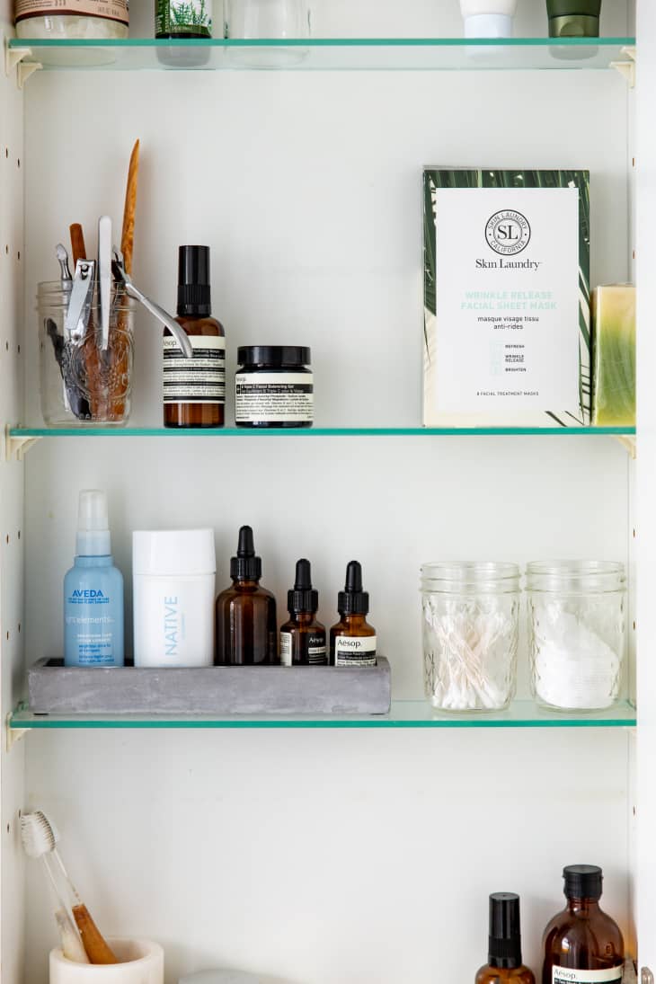 After much hemming and hawing, I realized what the root of the problem was: There’s tons of wasted space in our medicine cabinets. Most products we own — face moisturizers, kids’ bubble bath, and cotton swabs are rather squat. As a result, there’s a lot of empty space above each product. If only we had designed the cabinets to have more shelves…