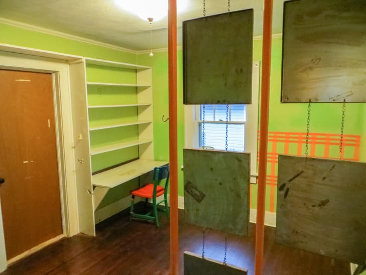 The previous owners had installed several built-in pieces—including a desk, shelving, and a decorative room divider—so we started by clearing the room. When the room divider came down, we found that the floors had been refinished around it, so we refinished them again ourselves and stained them lighter to play up the great original hardwoods.