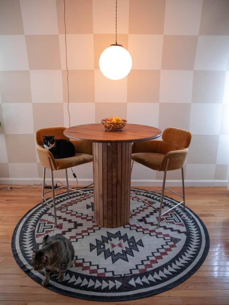 Rather than using paint, Zingg pulled off the look with textured peel-and-stick wallpaper, which she cut into square strips with scissors. According to the comments, she used a stud finder with a laser level to evenly affix them, as well. “The best part, it is easy and removable,” Zingg adds of the neutral-toned finished product, which is now the stylish backdrop to her well-decorated dining nook (featuring a round table and moon lamp that she also DIYed, NBD!).