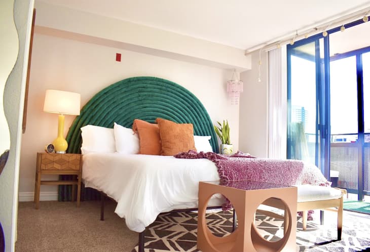 Posted by Bridgette Whitney, a maximalist interior decorator and muralist, the below video pans over a bed framed by a green semi-circle accent that looks straight out of Urban Outfitters. Can we just take a moment to appreciate that dreamy rich color!? Fast-forward to the next shot, and you’ll see Whitney holding an armload of multicolored pool noodles. See where this is going? Lo and behold, she built the headboard shown herself… with 40+ pool noodles, curved and taped together then wrapped in fabric. “My most ICONIC creation😩,” she captioned the TikTok, which has already racked up almost two million views.