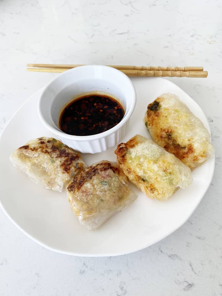 My love of dumplings is long-reaching, through winding annals of personal history that first began with my mom’s comforting wonton soup, ladled out on days when I had the sniffles as a kid. Even now, I get antsy if there isn’t at least one package of frozen dumplings in my freezer. (When making them at home, I’m liable to double or triple a batch, so that my future-self can satisfy a desire for dumplings at will.) But it happens and, sometimes, I run out of dumplings. What to do? I recently saw this viral TikTok trend, featuring pan-crisped, rice paper dumplings, and I knew what would be in my WFH lunch lineup next.