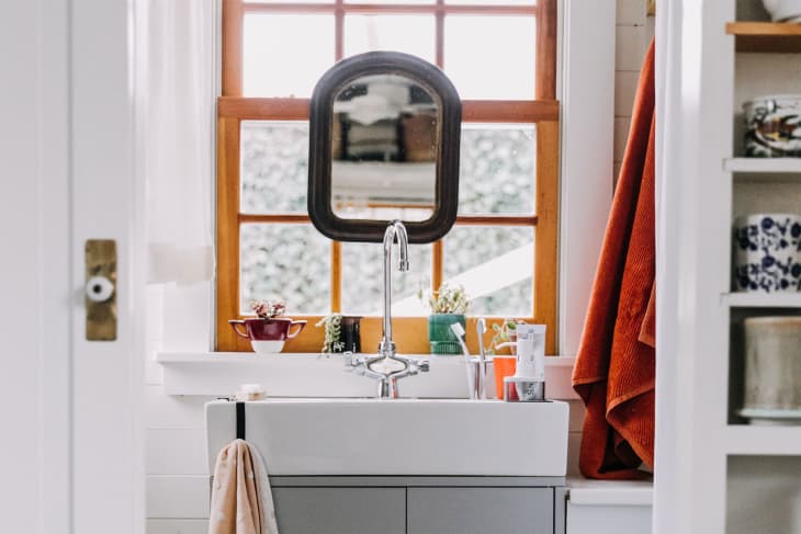 Julie Pointer Adams, a photographer, stylist and the former community director for Kinfolk magazine, shared this tiny 200-square-foot studio apartment in the Santa Barbara hills with her husband. Though not technically a tiny house, there’s no doubt this is a super small home. And their super small bathroom to match also shows how organic materials—as well as some plants—can help a teeny bathroom feel fresh.
