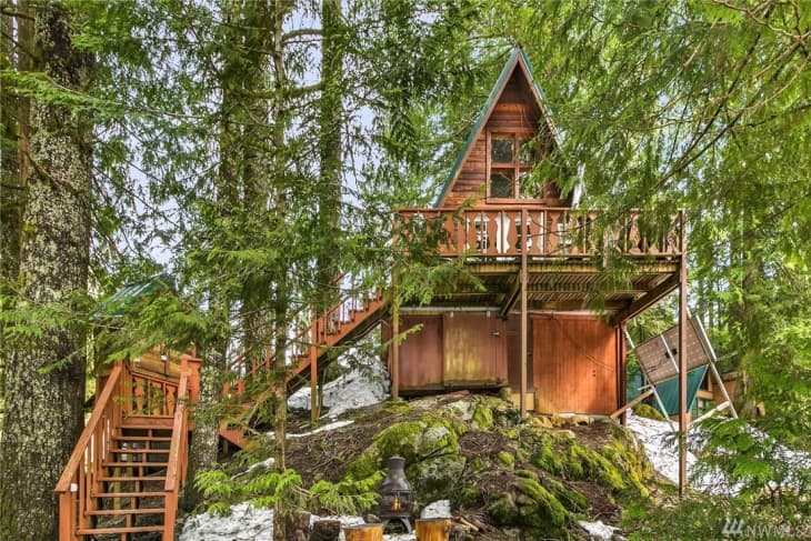 Here’s one outside of California: a lovely 508 square foot A-frame cabin that has two sleeping areas and an expansive deck, all for $208,000.