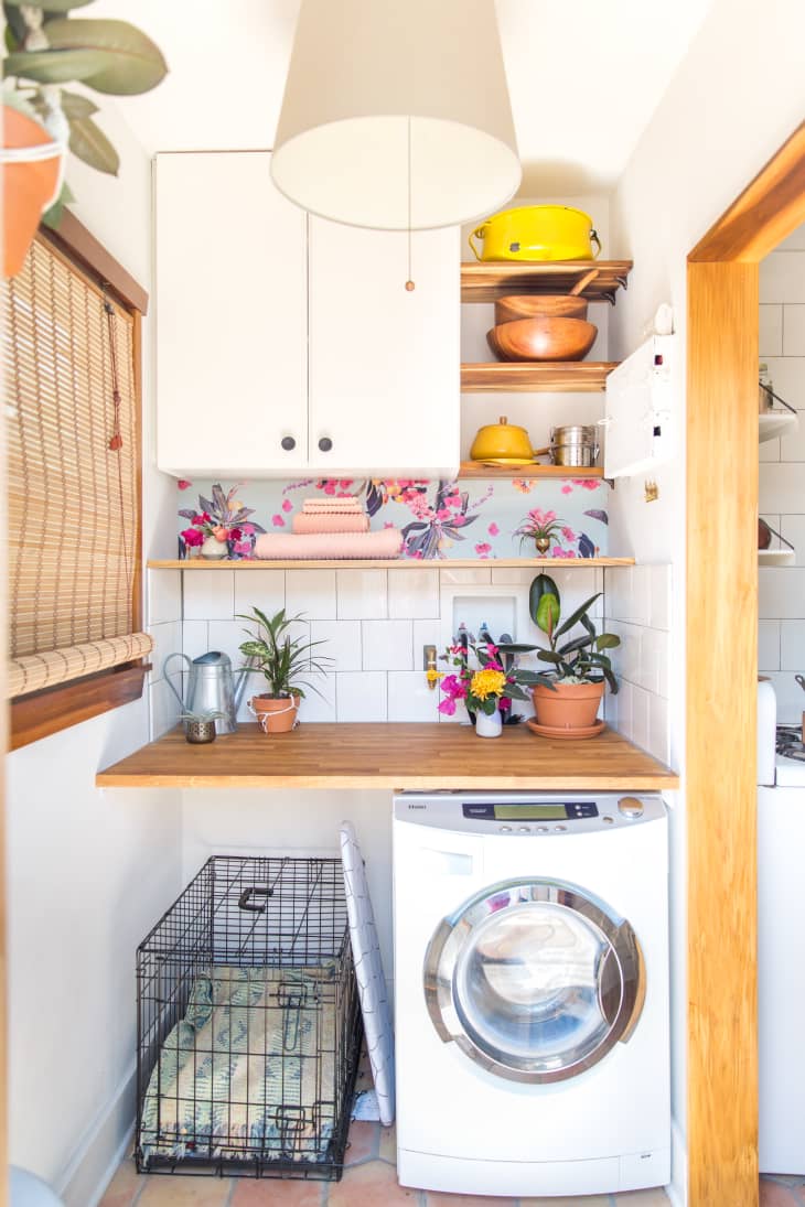 As for styling in this space, Morgan Watts says shelves are the key. “There are so few spots that come with a laundry room,” she says. “I would definitely custom build shelves and then just mix in some plants with towels or some decorative storage. Just mix it in so it gives off that balance of the plants with practical things.”
