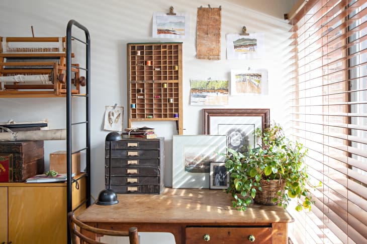 This mentality ultimately gives Burgess’s home a clutter-free yet lived-in look that’s brimming with personality and charm. While it’s undeniably more time consuming to collect these one-of-a-kind recycled receptacles versus immediately grabbing something from your local big box, it’s worth the wait (and way more sustainable and oftentimes more affordable) to curate your very own thoughtful, display-worthy assortment of bins, baskets, cabinets, and beyond. In fact, Burgess’ studio shelf DIY alone took two full years to actualize. If you do plan to follow in this homeowner’s secondhand storage-sourcing footsteps, she shares one piece of advice: “Have a list of the things you are still looking for when you go shopping.” That helps eliminate the inclination for “impulse buying,” she says, which is also key when you are dealing with a smaller space.