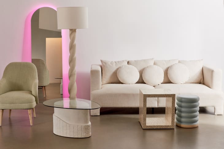 The pieces span four collections—Serene Space, Rustic Retreat, Eclectic Home, and Modern Studios. Items in the first two collections are more minimal, tonal, and sculptural in form, while the later two lean into maximalism, color, and even a little bit of kitsch. Affordable-ish design has come a long way, folks. Leather, jute, colored glass, capiz shell, concrete, abstract molded metal bases, and full-length mirrors outfitted with neon LEDs? These are remarkably trend-forward elements that you don’t have to go to a custom showroom to get.