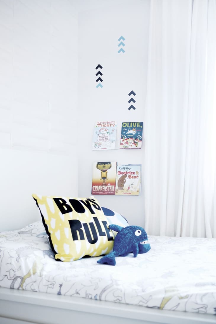 Baby Victor came along on July 27, 2012. During a hot Summer night in 2014, while washing the dishes, I heard a loud thud sound and an instant cry coming from upstairs. Before the little guy turned 2, he had already managed to climb his way out of the crib. We gave it another try thinking that maybe it had been a lucky night when he managed to “escape”, but the very next night, we were faced with the same scenario. So out goes the crib and in comes the bed. I chose this IKEA bed because of its color, clean lines, and the bonus large drawers underneath it for the much-needed storage space. This bed is perfect for this room. We added some acrylic shelving next to the new bed for his favorite books plus a few new wall decals. A fun bedding from Dwell Studio plus some modern pillows and voilà, we had a big boy bedroom for the “big” guy.