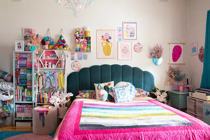 That’s what crafter and photographer, Phebe Rendulić did when live gave her lemons… er, a stained ottoman, which you can see beside her bed in the photo above. She counts this projects as one of her favorite DIYs in the Victoria, Australia, home she shares with her roommate, Michael. “The ‘blob patch’ ottoman I’d mended after spilling a drink on it ended up featured in frankie magazine,” she tells us, where lots of her original crafts are featured as well. The ottoman itself was just a K-Mart purchase, but I admire the sustainable practice of keeping and mending items that are otherwise still perfectly useful. In the print feature of the ottoman, Rendulić says the stain itself was already sort of “blob-shaped,” and reminded her of the drippy, gloopy sculptures by artist Dan Lam.