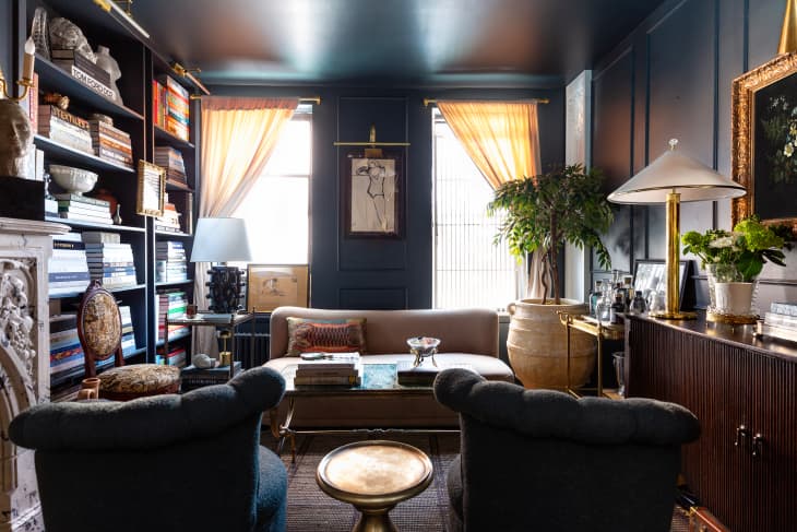 If you choose to order a brown rug for your space, consider pairing it with lighter colored furnishings as I did. My sofa is beige, which helps prevent my space from feeling too cave-like between the brown underfoot and the blue on the walls. I also get a lot of natural light in my living room, which works wonders to brighten up the space and keep things light and airy despite all of my moody decor.