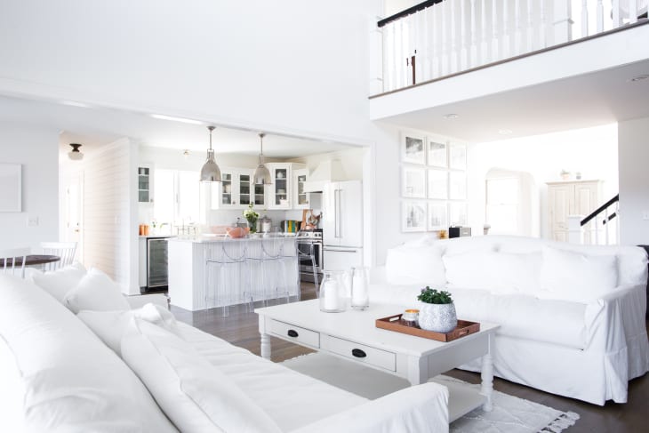 Another great way to pull off the white aesthetic, Lester says, is to go for a super tight-fitting slipcover. “When done right, a fitted slipcover will give the illusion of a fully-upholstered piece and give you the ability to launder (delicate wash on cold) and/or dry clean when you have spills. A really well-done slipcover is a godsend, and has saved my white sofa many a time!”