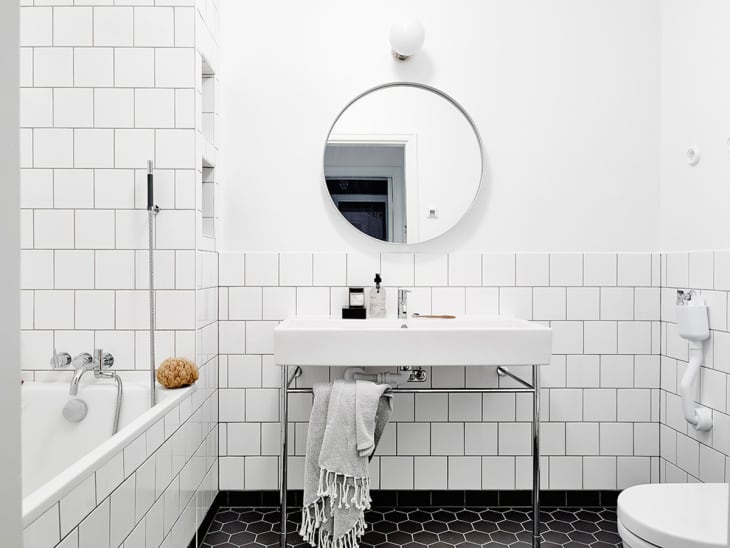 Above (and lead image): In this bathroom from Entrance, square tile contributes to a graphic, modern look. The black hex tile on the floor is a nice pairing.