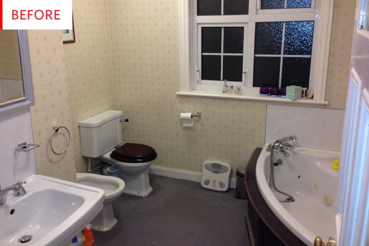 When we moved in to our Edwardian house there were two bathrooms next to each other. One had a corner bath, toilet and sink and the other a shower, toilet and sink. Both had lowered ceilings, stained carpets and really the most hideous windows I think I have ever seen.